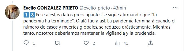 Pese a estos datos preocupantes se sigue afirmando que «la pandemia ha terminado». Ojalá fuera así. La pandemia terminará cuando el número de casos y muertes globales, se reduzca drásticamente. Mientras tanto, nosotros deberíamos mantener la vigilancia y la prudencia.