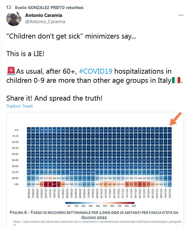 EN INGLÉS «Los niños no se enferman» dicen los minimizadores… ¡Esto es una mentira! 🚨Como es habitual, después de los 60+, las hospitalizaciones por #COVID19 en niños de 0 a 9 años son más que en otros grupos de edad en Italia🇮🇹. ¡Compártelo! ¡Y difunde la verdad!
