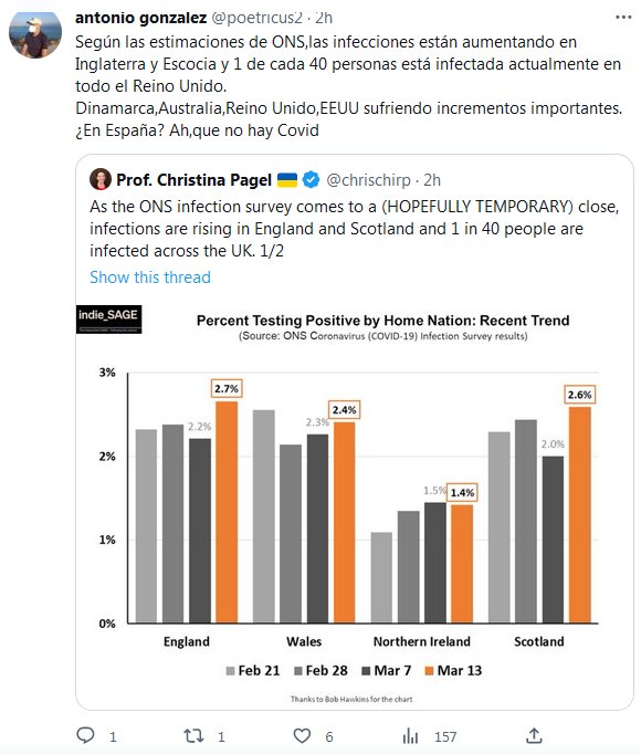 MUCHO DE LA PANDEMIA ES REALIDAD Y MUCHO DEL NEGACIONISMO ES MENTIRA …las infecciones están aumentando en Inglaterra y Escocia y 1 de cada 40 personas está infectada actualmente en todo el Reino Unido. Dinamarca,Australia,Reino Unido,EEUU sufriendo incrementos importantes. ¿En España? Ah,que no hay Covid