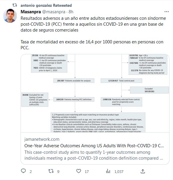 Resultados adversos a un año entre adultos estadounidenses con síndorme post-COVID-19 (PCC) frente a aquellos sin COVID-19 en una gran base de datos de seguros comerciales Tasa de mortalidad en exceso de 16,4 por 1000 personas en personas con PCC (SINDROME POST COVID)