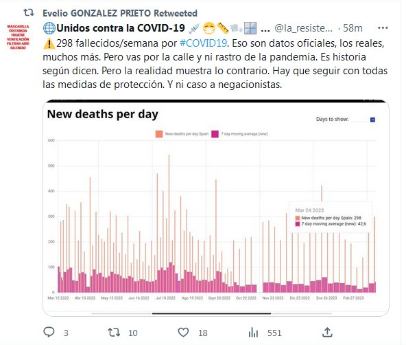 ⚠️298 fallecidos/semana por #COVID19. Eso son datos oficiales, los reales, muchos más. Pero vas por la calle y ni rastro de la pandemia. Es historia según dicen. Pero la realidad muestra lo contrario. Hay que seguir con todas las medidas de protección. Y ni caso a negacionistas.