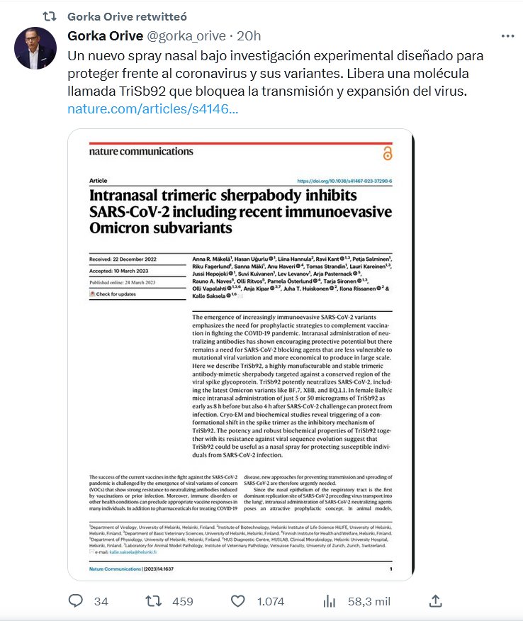 Un nuevo spray nasal bajo investigación experimental diseñado para proteger frente al coronavirus y sus variantes. Libera una molécula llamada TriSb92 que bloquea la transmisión y expansión del virus.