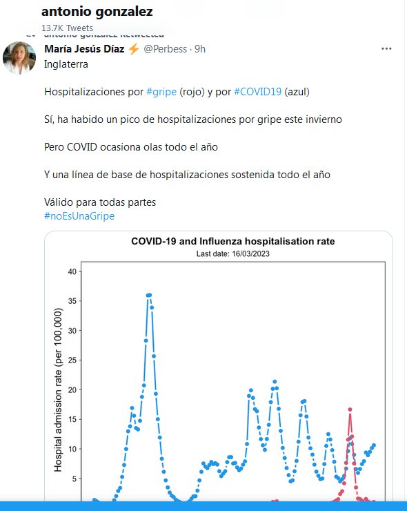 Inglaterra Hospitalizaciones por #gripe (rojo) y por #COVID19 (azul) Sí, ha habido un pico de hospitalizaciones por gripe este invierno Pero COVID ocasiona olas todo el año Y una línea de base de hospitalizaciones sostenida todo el año Válido para todas partes #noEsUnaGripe