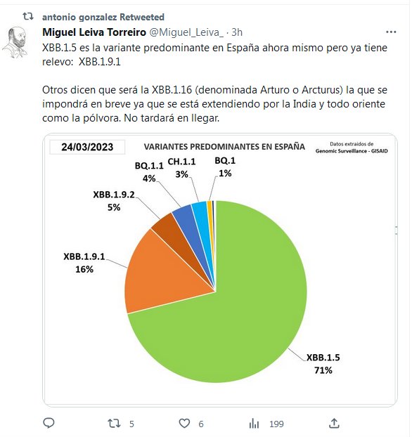 PANDEMIA LIBERADA=PANDEMIA SIN FIN XBB.1.5 es la variante predominante en España ahora mismo pero ya tiene relevo: XBB.1.9.1 Otros dicen que será la XBB.1.16 (denominada Arturo o Arcturus) la que se impondrá en breve ya que se está extendiendo por la India y todo oriente como la pólvora. No tardará en llegar.