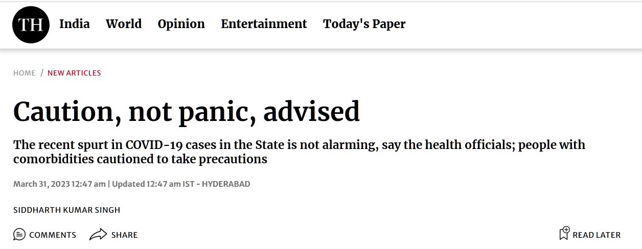 EN INGLÉS Precaución, no pánico, aconsejado Hasta ahora, sus datos muestran que la variante preocupante es XBB 1.5. Las estadísticas de la OMS revelan que aunque los casos son altos, los casos de hospitalización correspondientes son muy bajos en comparación