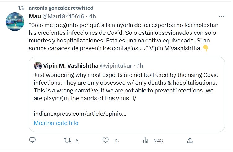 «Solo me pregunto por qué a la mayoría de los expertos no les molestan las crecientes infecciones de Covid. Solo están obsesionados con solo muertes y hospitalizaciones. Esta es una narrativa equivocada. Si no somos capaces de prevenir los contagios……» Vipin M.Vashishtha