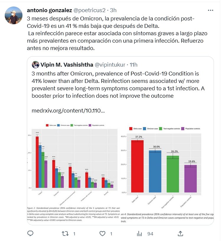 3 meses después de Omicron, la prevalencia de la condición post-Covid-19 es un 41 % más baja que después de Delta. La reinfección parece estar asociada con síntomas graves a largo plazo más prevalentes en comparación con una primera infección. Refuerzo antes no mejora resultado.