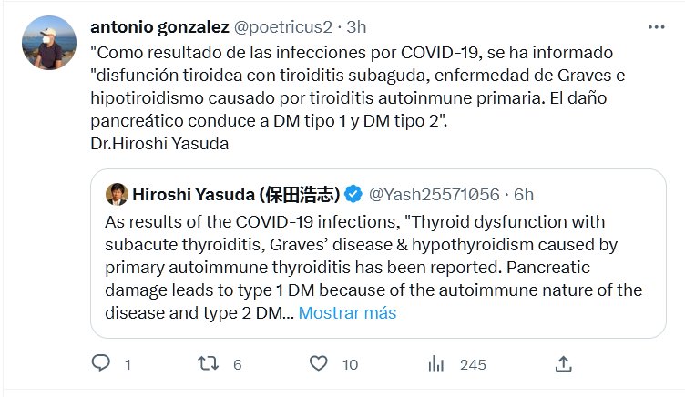 «Como resultado de las infecciones por COVID-19, se ha informado «disfunción tiroidea con tiroiditis subaguda, enfermedad de LAS Graves e hipotiroidismo causado por tiroiditis autoinmune primaria. El daño pancreático conduce a DM tipo 1 y DM tipo 2». Dr.Hiroshi Yasuda