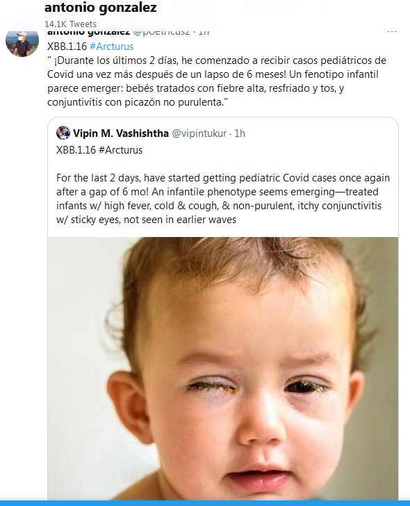 XBB.1.16 #Arcturus » ¡Durante los últimos 2 días, he comenzado a recibir casos pediátricos de Covid una vez más después de un lapso de 6 meses! Un fenotipo infantil parece emerger: bebés tratados con fiebre alta, resfriado y tos, y conjuntivitis con picazón no purulenta.»