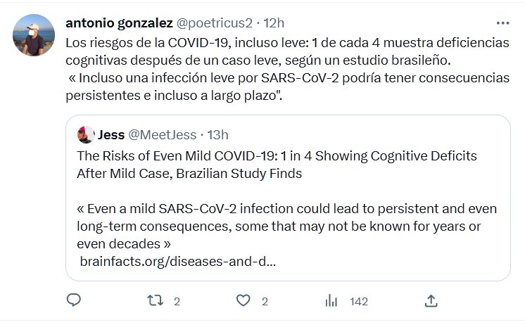 Los riesgos de la COVID-19, incluso leve: 1 de cada 4 muestra deficiencias cognitivas después de un caso leve, según un estudio brasileño. « Incluso una infección leve por SARS-CoV-2 podría tener consecuencias persistentes e incluso a largo plazo».