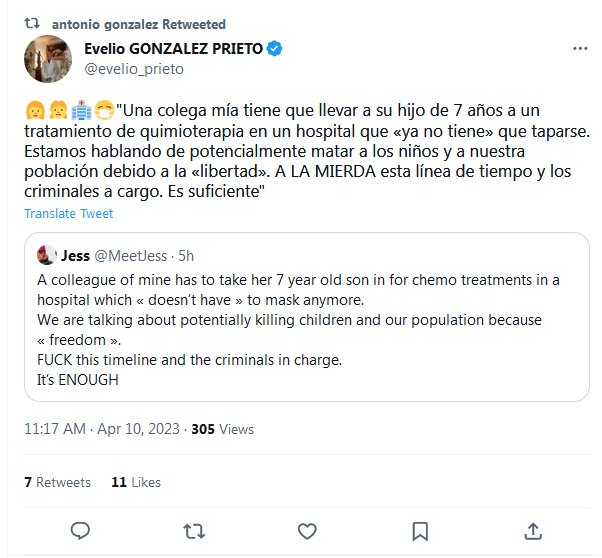 PANDEMIA LIBERADA 👩👧🏥😷»Una colega mía tiene que llevar a su hijo de 7 años a un tratamiento de quimioterapia en un hospital que «ya no tiene» que taparse. Estamos hablando de potencialmente matar a los niños y a nuestra población debido a la «libertad». A LA MIERDA esta línea de tiempo y los criminales a cargo. Es suficiente»