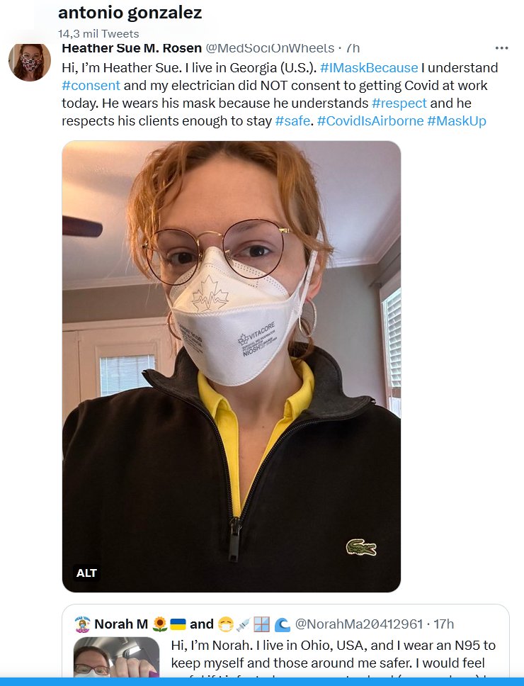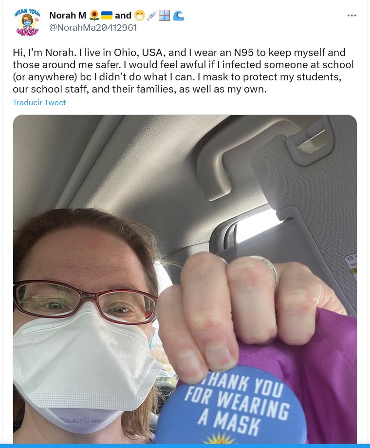CAMPAÑA CELESTIAL (EN INGLÉS) Hola soy Nora. Vivo en Ohio, EE. UU., y uso un N95 para mantenerme a mí y a los que me rodean más seguros. Me sentiría muy mal si infectara a alguien en la escuela (o en cualquier lugar) porque no hice lo que pude. Me enmascaro para proteger a mis estudiantes, al personal de nuestra escuela y a sus familias, así como a la mía.