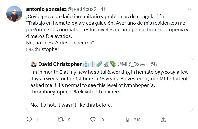 ¡Covid provoca daño inmunitario y problemas de coagulación! «Trabajo en hematología y coagulación. Ayer uno de mis residentes me preguntó si es normal ver estos niveles de linfopenia, trombocitopenia y dímeros D elevados. No, no lo es. Antes no ocurría». Dr.Christopher