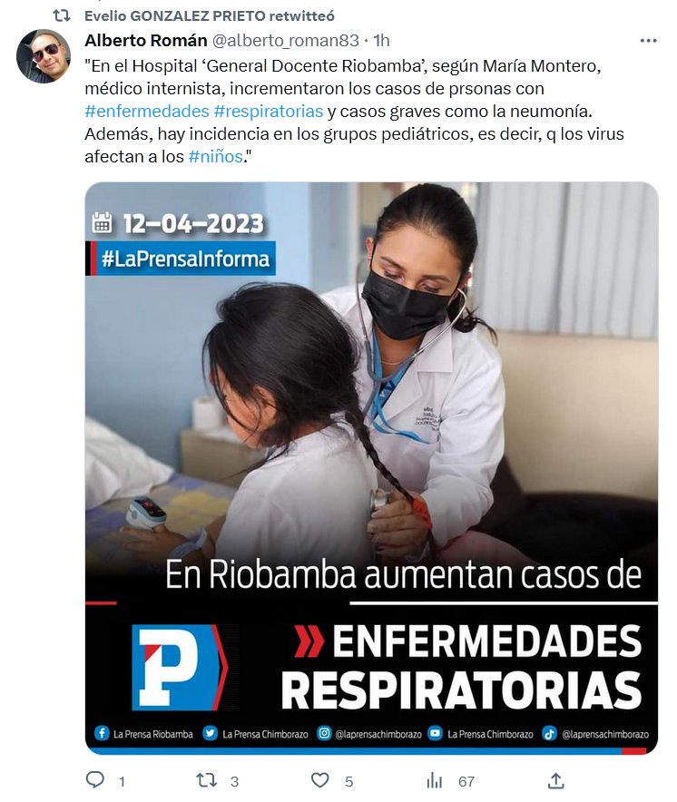 «En el Hospital ‘General Docente Riobamba’, según María Montero, médico internista, incrementaron los casos de prsonas con #enfermedades #respiratorias y casos graves como la neumonía. Además, hay incidencia en los grupos pediátricos, es decir, q los virus afectan a los #niños.»