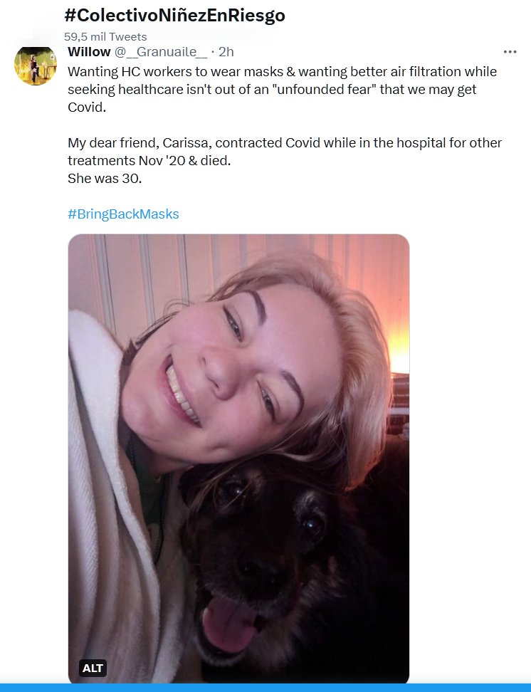 EN INGLÉS Querer que los trabajadores de HC usen máscaras y querer una mejor filtración de aire mientras buscan atención médica no es por un «miedo infundado» de que podamos contraer Covid. Mi querida amiga, Carissa, contrajo Covid mientras estaba en el hospital para recibir otros tratamientos el 20 de noviembre y murió. Ella tenía 30 años.