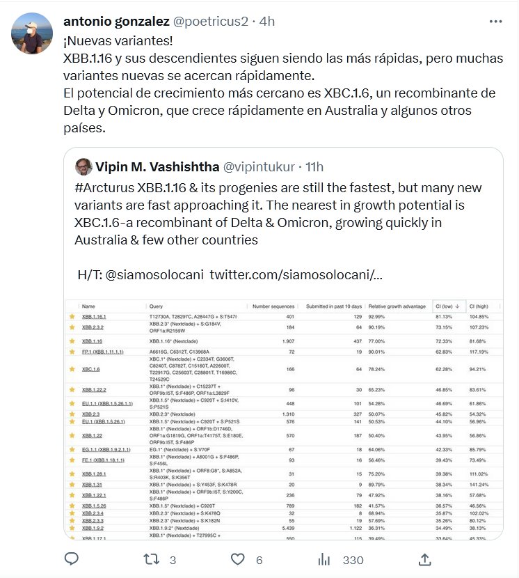 LA PANDEMIA TERMINÓ? ¡Nuevas variantes! XBB.1.16 y sus descendientes siguen siendo las más rápidas, pero muchas variantes nuevas se acercan rápidamente. El potencial de crecimiento más cercano es XBC.1.6, un recombinante de Delta y Omicron, que crece rápidamente en Australia y algunos otros países.
