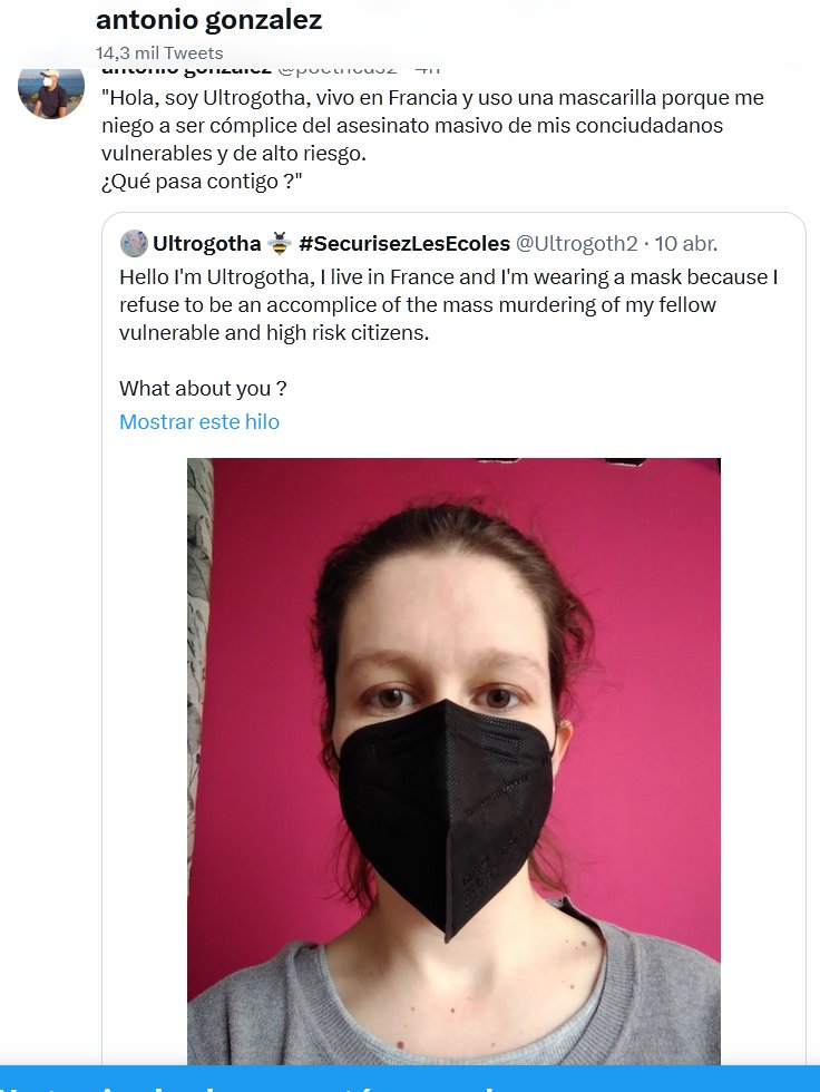 TESTIMONIO «Hola, soy Ultrogotha, vivo en Francia y uso una mascarilla porque me niego a ser cómplice del asesinato masivo de mis conciudadanos vulnerables y de alto riesgo. ¿Qué pasa contigo ?»