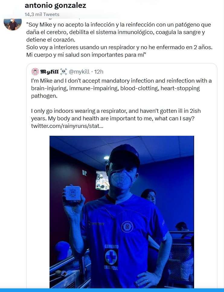 TESTIMONIO «Soy Mike y no acepto la infección y la reinfección con un patógeno que daña el cerebro, debilita el sistema inmunológico, coagula la sangre y detiene el corazón. Solo voy a interiores usando un respirador (¿MASCARILLA?) y no he enfermado en 2 años. Mi cuerpo y mi salud son importantes para mí»