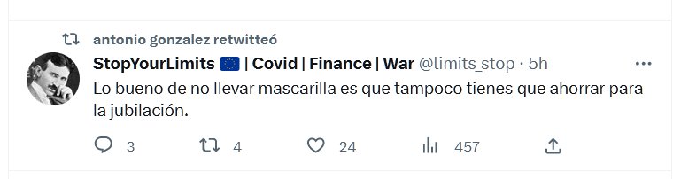 TRÁGICO HUMOR NEGRO Lo bueno de no llevar mascarilla es que tampoco tienes que ahorrar para la jubilación. Posted on abril 12, 2023 por coronado
