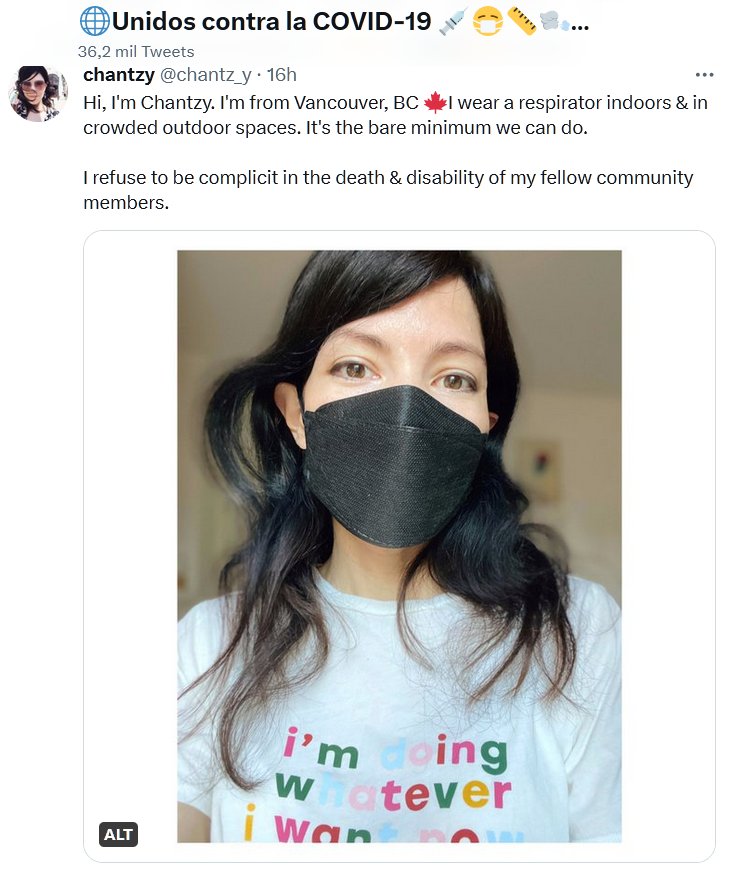 CAMPAÑA CELESTIAL (EN INGLÉS) Hola, soy Chantzy. Soy de Vancouver, BC 🍁Uso MASCARILLA en interiores y en espacios al aire libre llenos de gente. Es lo mínimo que podemos hacer. Me niego a ser cómplice de la muerte y discapacidad de mis compañeros miembros de la comunidad.