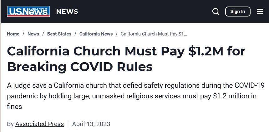 AHORA VIENEN LOS JUICIOS (EN INGLÉS) Iglesia de California debe pagar $1.2 millones por romper las reglas de COVID Posted on abril 14, 2023 por coronado https://www.usnews.com/news/best-states/california/articles/2023-04-13/california-church-must-pay-1-2m-for-breaking-covid-rules