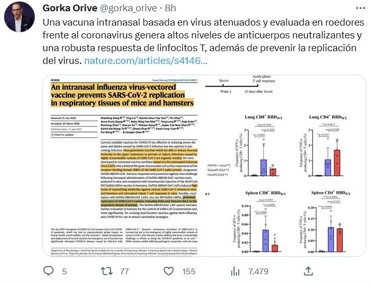 NATURE (EN INGLÉS) Una vacuna intranasal basada en virus atenuados y evaluada en roedores frente al coronavirus genera altos niveles de anticuerpos neutralizantes y una robusta respuesta de linfocitos T, además de prevenir la replicación del virus