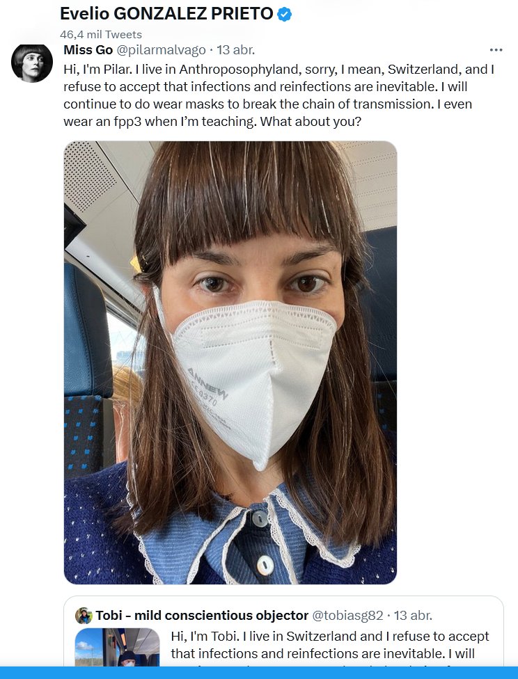 CAMPAÑA CELESTIAL (EN INGLÉS) Hola soy Pilar. Vivo en Anthroposophyland, lo siento, quiero decir, Suiza, y me niego a aceptar que las infecciones y reinfecciones son inevitables. Seguiré usando mascarillas para romper la cadena de transmisión. Incluso uso un fpp3 cuando estoy enseñando. ¿Qué pasa contigo?