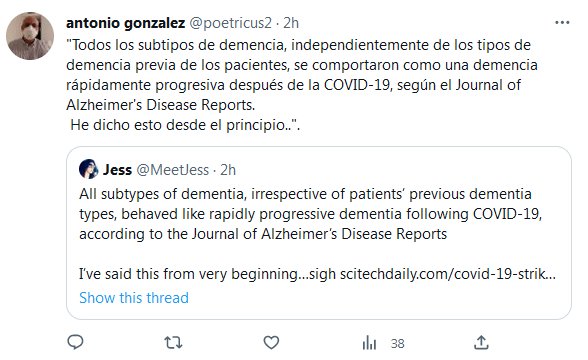 «Todos los subtipos de demencia, independientemente de los tipos de demencia previa de los pacientes, se comportaron como una demencia rápidamente progresiva después de la COVID-19, según el Journal of Alzheimer’s Disease Reports. He dicho esto desde el principio..».