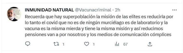 Recuerda que hay superpoblación, la misión de las elites es reducirla, por lo tanto el covid, que no es de ningún murciélago, es de laboratorio, y la vacuna, es la misma mierda, y tiene la misma misión, y así reducimos pensiones, van a por nosotros y los medios de comunicación : cómplices