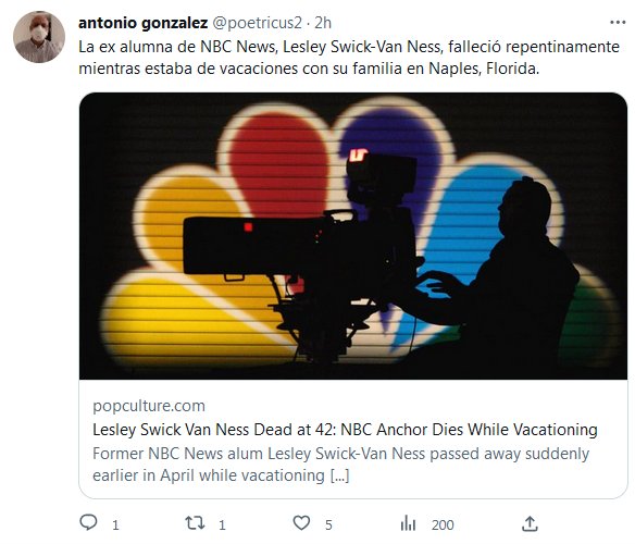 «NOCOVID» Y POSTCOVID HACEN ESTRAGOS La ex alumna de NBC News, Lesley Swick-Van Ness, falleció repentinamente mientras estaba de vacaciones con su familia en Naples, Florida. Posted on abril 18, 2023 por coronado