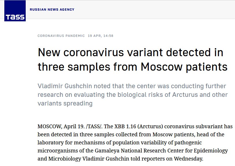 AGENCIA TASS (EN INGLÉS ) Nueva variante de coronavirus detectada en tres muestras de pacientes de Moscú Posted on abril 19, 2023 por coronado https://tass.com/world/1606813