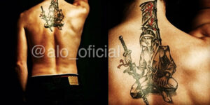 ALONSO luce en la espalda un poderoso tatuaje de un samurai agachado, sobre la funda de una katana, en colores negro y rojo, realizado en un estudio de Oviedo