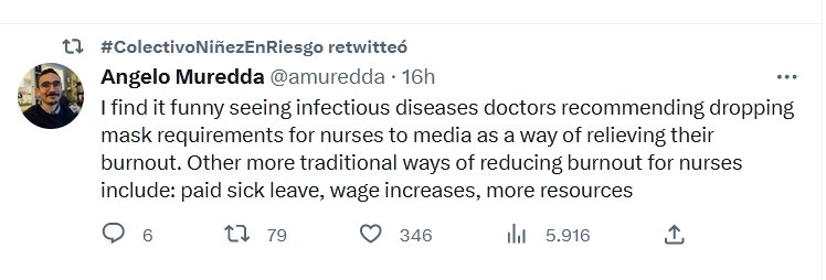 EN INGLÉS Me resulta divertido ver a los médicos de enfermedades infecciosas recomendar a los medios que eliminen los requisitos de máscaras para las enfermeras como una forma de aliviar su agotamiento. Otras formas más tradicionales de reducir el agotamiento de las enfermeras incluyen: licencia por enfermedad pagada, aumentos salariales, más recursos