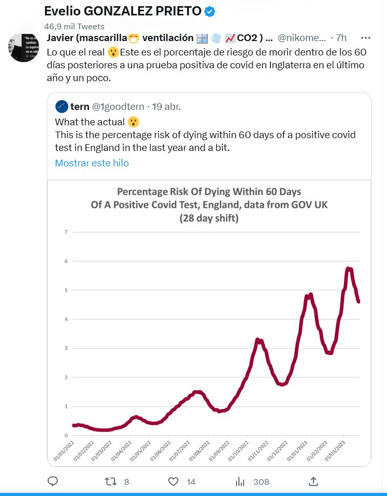 Lo que el real 😮Este es el porcentaje de riesgo de morir dentro de los 60 días posteriores a una prueba positiva de covid en Inglaterra en el último año y un poco.