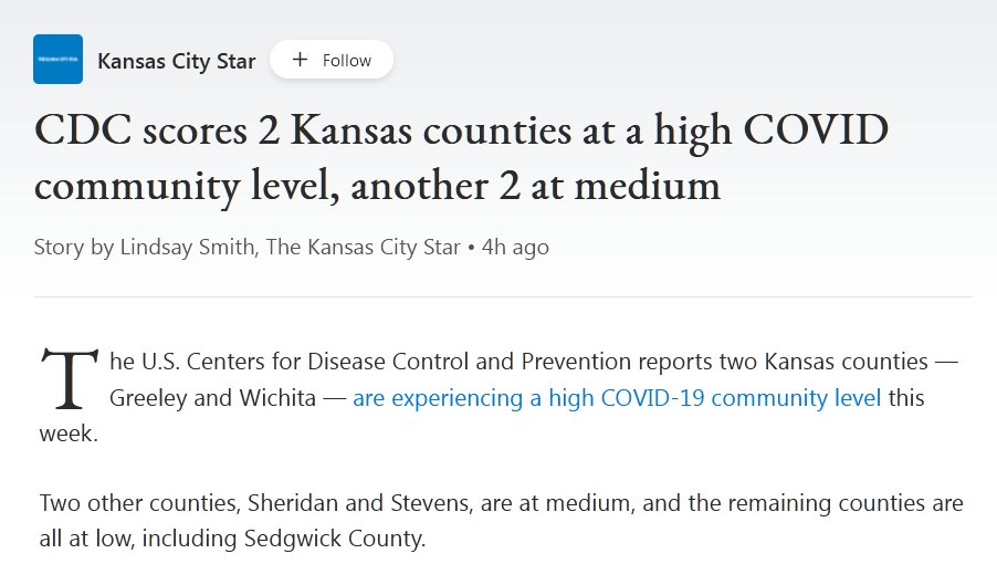 EE.UU. (EN INGLÉS) CDC califica a 2 condados de Kansas en un nivel alto de comunidad de COVID, otros 2 en medio Posted on abril 23, 2023 por coronado https://www.msn.com/en-us/news/other/cdc-scores-2-kansas-counties-at-a-high-covid-community-level-another-2-at-medium/ar-AA1adCQW