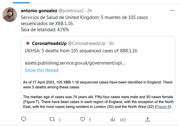 LA ARCTURUS TIENE UNA LETALIDAD DE CASI 5%, AÚN CON VACUNAS??? Servicios de Salud de United Kingdom: 5 muertes de 105 casos secuenciados de XBB.1.16. Tasa de letalidad: 4,76% Posted on abril 23, 2023 por coronado