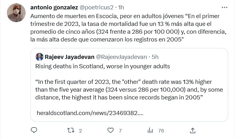 SERÁ LA LEVE «GRIPECITA»? Aumento de muertes en Escocia, peor en adultos jóvenes “En el primer trimestre de 2023, la tasa de mortalidad fue un 13 % más alta que el promedio de cinco años (324 frente a 286 por 100 000) y, con diferencia, la más alta desde que comenzaron los registros en 2005″