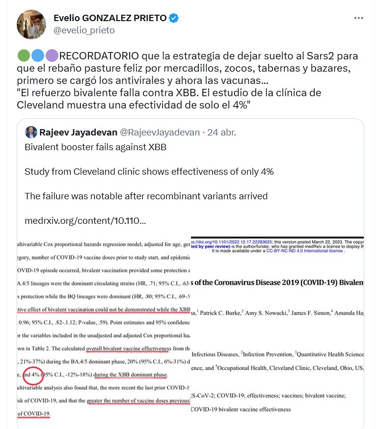 🟢🔵🟣RECORDATORIO que la estrategia de dejar suelto al Sars2 para que el rebaño pasture feliz por mercadillos, zocos, tabernas y bazares, primero se cargó los antivirales y ahora las vacunas… «El refuerzo bivalente falla contra XBB. El estudio de la clínica de Cleveland muestra una efectividad de solo el 4%»
