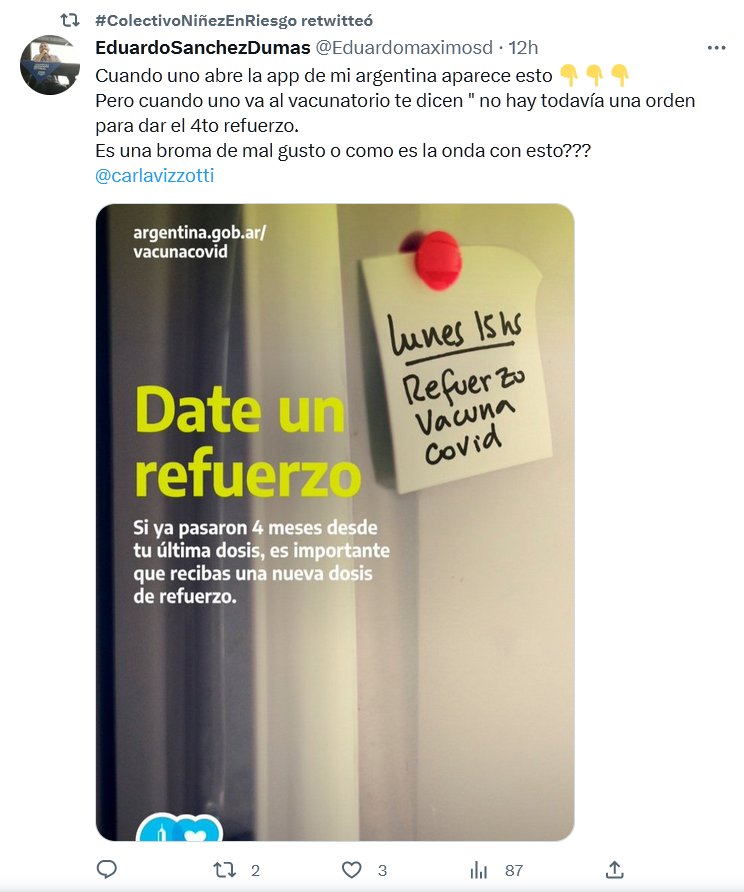 Cuando uno abre la app de mi argentina aparece esto 👇👇👇 («DATE UN REFUERZO») Pero cuando uno va al vacunatorio te dicen » no hay todavía una orden para dar el 4to refuerzo. Es una broma de mal gusto o como es la onda con esto??? @carlavizzotti