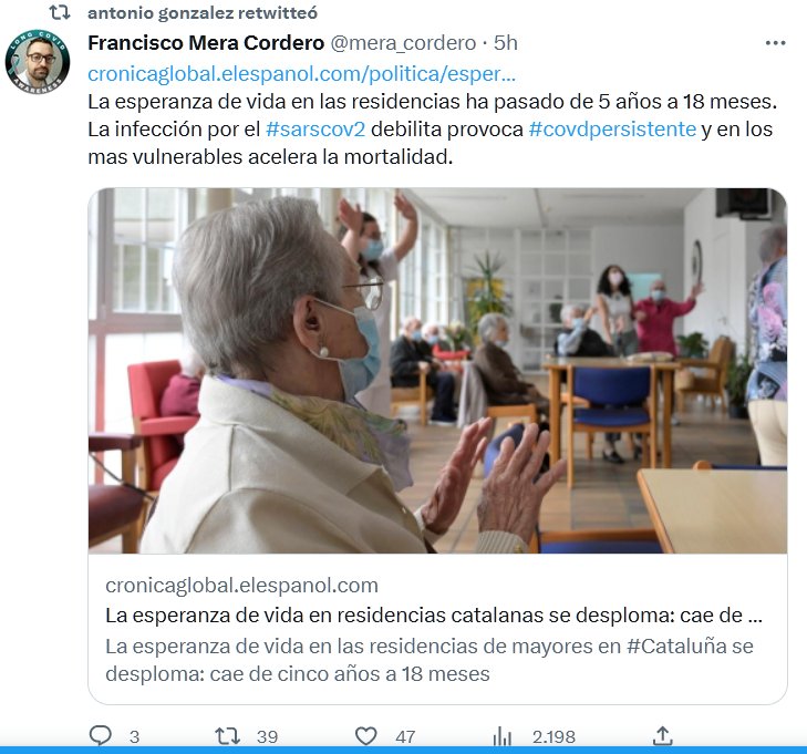 La esperanza de vida en las residencias (GERIÁTRICOS) ha pasado de 5 años a 18 meses. La infección por el #sarscov2 debilita, provoca #covdpersistente y en los mas vulnerables acelera la mortalidad.