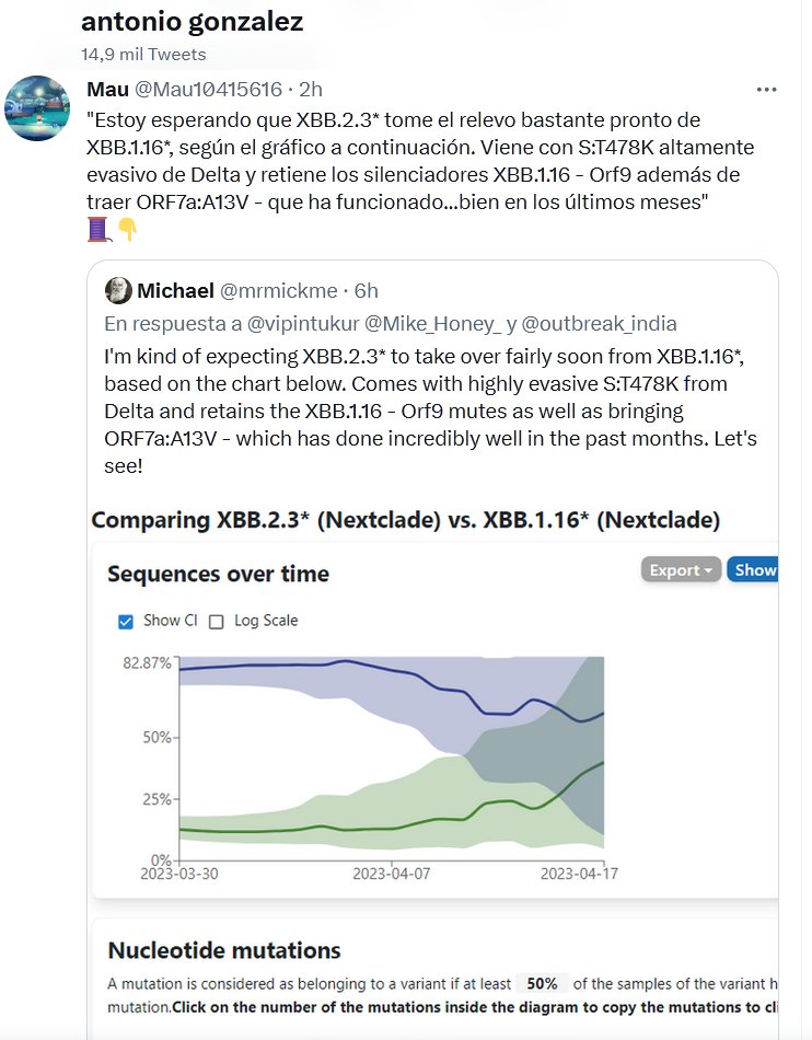 A LA KRAKEN2 LE PUSIERON ARCTURUS ¿Y A LA KRAKEN3? «Estoy esperando que XBB.2.3* tome el relevo bastante pronto de XBB.1.16*, según el gráfico a continuación. Viene con S:T478K altamente evasivo de Delta y retiene los silenciadores XBB.1.16 – Orf9 además de traer ORF7a:A13V – que ha funcionado…bien en los últimos meses»