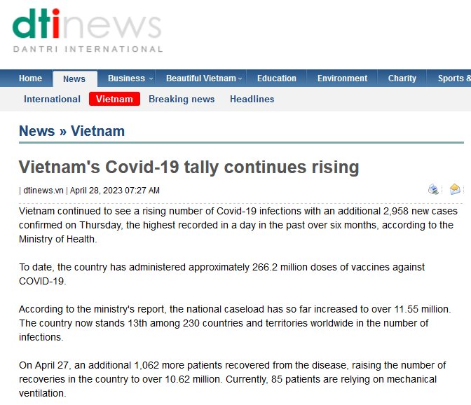 EN INGLÉS La cuenta de Covid-19 de Vietnam sigue aumentando Posted on abril 28, 2023 por coronado http://dtinews.vn/en/news/017002/83645/vietnam-s-covid-19-tally-continues-rising.html