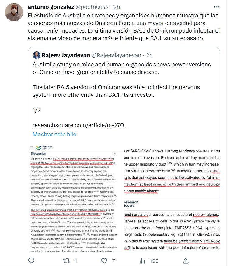 NO VA A SER GRATIS… El estudio de Australia en ratones y organoides humanos muestra que las versiones más nuevas de Omicron tienen una mayor capacidad para causar enfermedades. La última versión BA.5 de Omicron pudo infectar el sistema nervioso de manera más eficiente que BA.1, su antepasado.