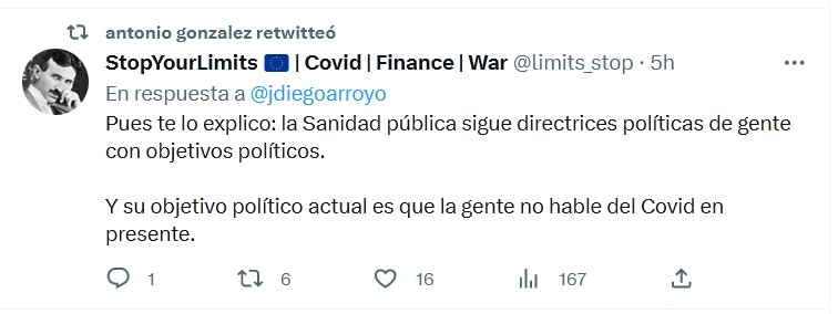 «Pues te lo explico: la Sanidad pública sigue directrices políticas de gente con objetivos políticos. Y su objetivo político actual es que la gente no hable del Covid en presente.» Posted on abril 30, 2023 por coronado