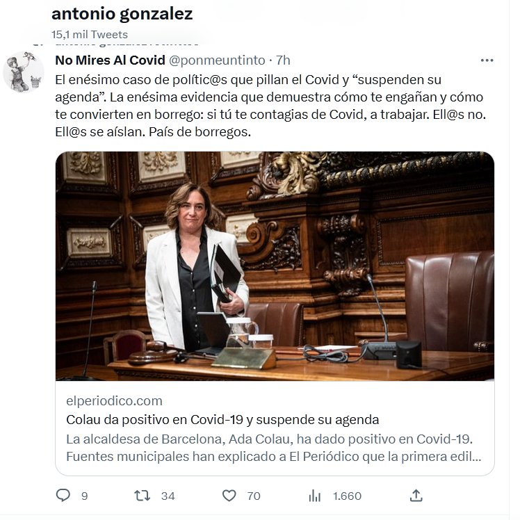 El enésimo caso de polític@s que pillan el Covid y “suspenden su agenda”. La enésima evidencia que demuestra cómo te engañan y cómo te convierten en borrego: si tú te contagias de Covid, a trabajar. Ell@s no. Ell@s se aíslan. País de borregos.