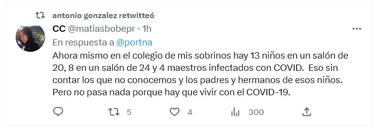 LESA HUMANIDAD Ahora mismo en el colegio de mis sobrinos hay 13 niños en un salón de 20, 8 en un salón de 24 y 4 maestros infectados con COVID. Eso sin contar los que no conocemos y los padres y hermanos de esos niños. Pero no pasa nada porque hay que vivir con el COVID-19.