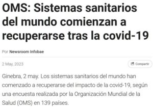 Los sistemas sanitarios del mundo han comenzado a recuperarse del impacto de la covid-19, según una encuesta realizada por la Organización Mundial de la Salud (OMS) en 139 países Posted on mayo 2, 2023 por coronado https://www.infobae.com/america/agencias/2023/05/02/oms-sistemas-sanitarios-del-mundo-comienzan-a-recuperarse-tras-la-covid-19/