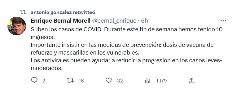 Suben los casos de COVID. Durante este fin de semana hemos tenido 10 ingresos. Importante insistir en las medidas de prevención: dosis de vacuna de refuerzo y mascarillas en los vulnerables. Los antivirales pueden ayudar a reducir la progresión en los casos leves-moderados.