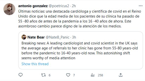 Últimas noticias: una destacada cardióloga y científica de covid en el Reino Unido dice que la edad media de los pacientes de su clínica ha pasado de 55 -80 años de antes de la pandemia a los 16 -40 años de ahora. Este asombroso cambio parece digno de la atención de los medios.