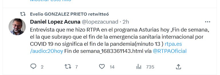 Daniel Lopez Acuna @lopezacunad · Entrevista que me hizo RTPA en el programa Asturias hoy ,Fin de semana, el la que subrayo que el fin de la emergencia sanitaria internacional por COVID 19 no significa el fin de la pandemia